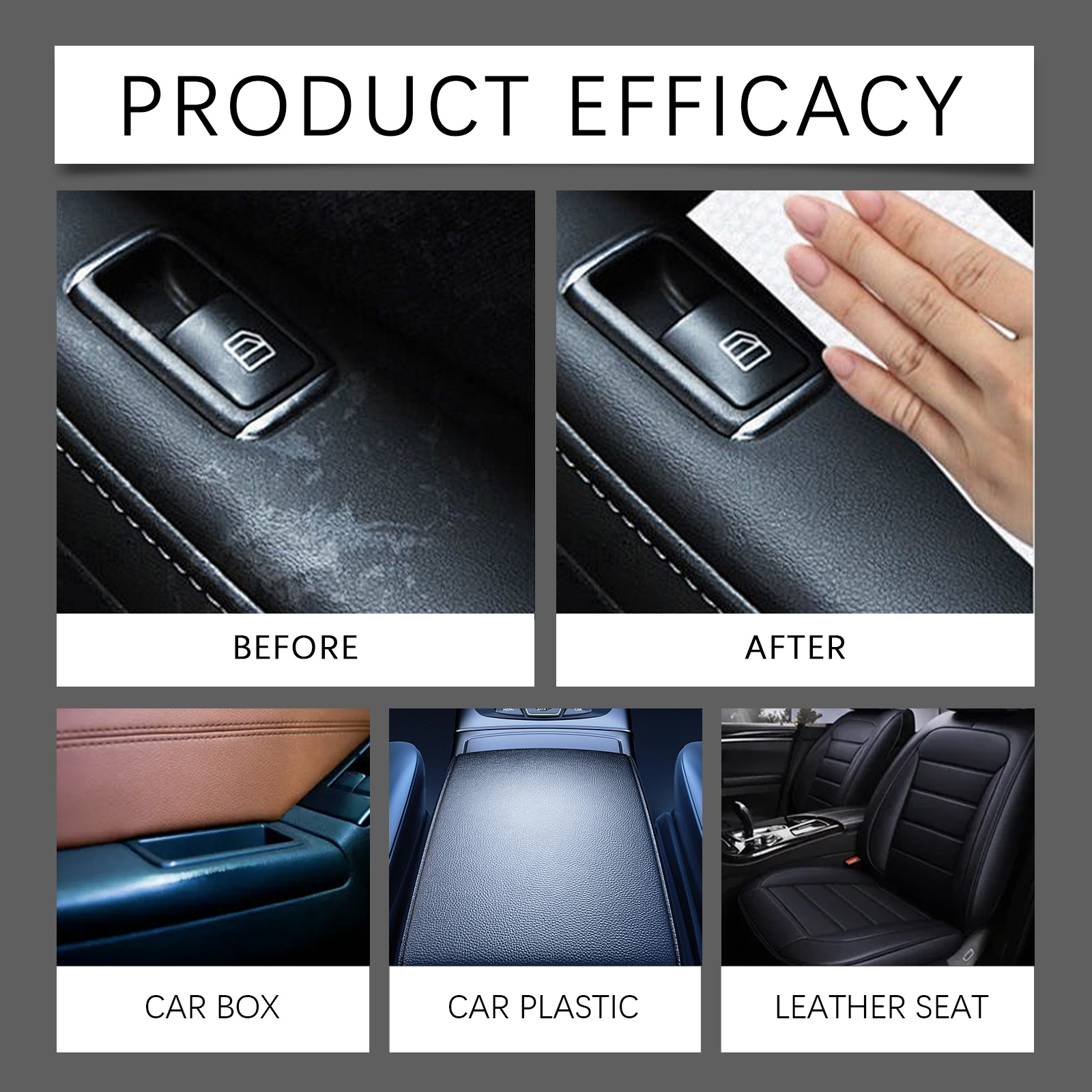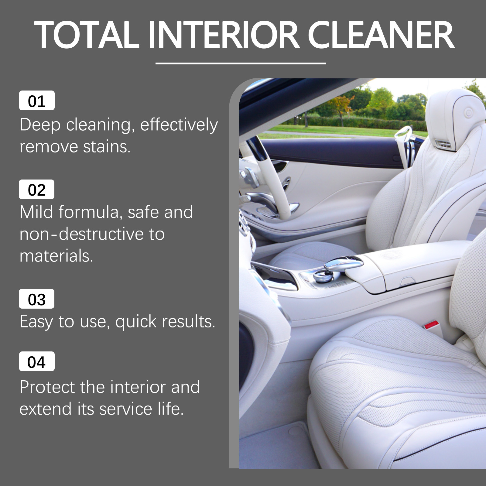 Our car interior cleaner contains tetrafluoroethylene. It can quickly break down stains and impurities, enhancing the cleaning efficiency. The usage method is very simple: make sure the cleaning surface is free of any impurities, and shake well before use. Spray a small amount of the liquid on the cleaned surface and repeat several times. Wipe with a soft and clean cloth, and use a brush for extremely dirty areas. It can also quickly remove minor dust, fingerprints and surface stains inside the car, making the car as shiny as new.